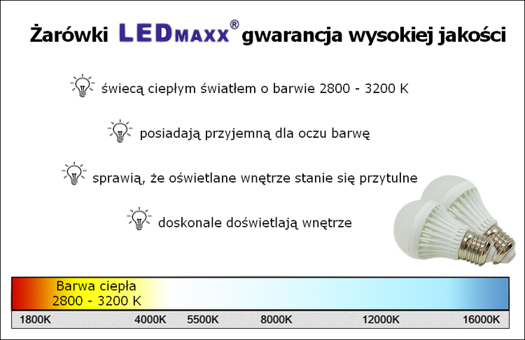 Żarówki marki LedMaxx świecą ciepłym światłem o barwie 2800-3200 K. Doskonale doświetlają wnętrze.