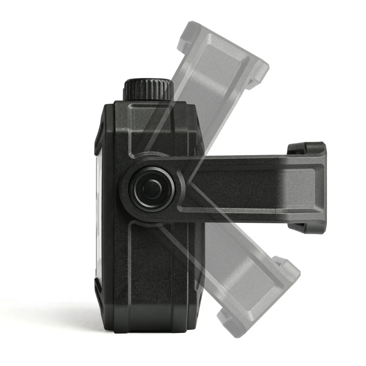 Obudowa wykonana z wytrzymałego poliamidu i aluminium. Magnetyczna podstawa umożliwia montaż na metalowych powierzchniach, a obrotowy uchwyt z rączką 360° pozwala ustawić kierunek światła pod dowolnym kątem. Latarka posiada również gwint do statywu, co ułatwia użycie w warsztacie lub podczas zdjęć.