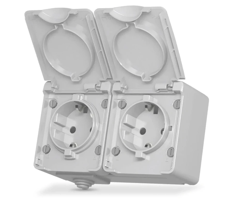 Podwójne gniazdo z serii VIDEX BINERA to doskonałe rozwiązanie do zastosowań zewnętrznych i wymagających wysokiej ochrony przed czynnikami zewnętrznymi. Dzięki klasie szczelności IP65 zapewnia niezawodną ochronę przed wodą i kurzem, co czyni je idealnym wyborem do użytku na zewnątrz budynków.